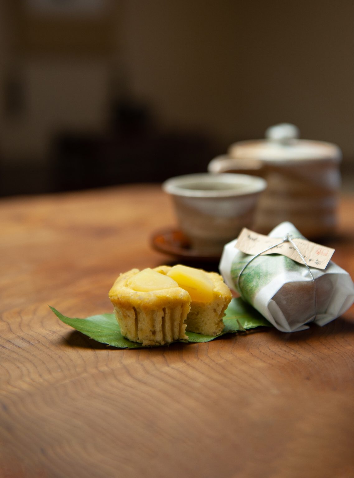 栗きんとんにバターと卵を加え、大粒の栗をのせました。木の葉を模した上品な焼き菓子です。