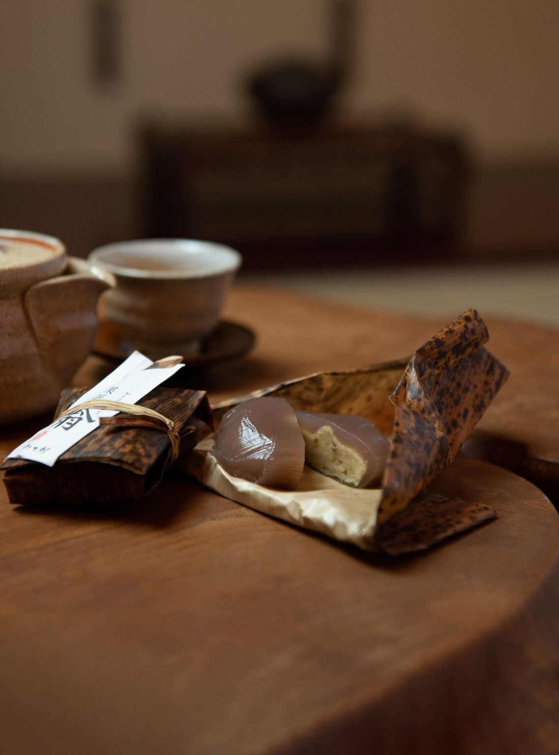 深山の郷の栗きんとんを葛粉で作った生地で包み竹皮を巻いて蒸しあげた和菓子です。